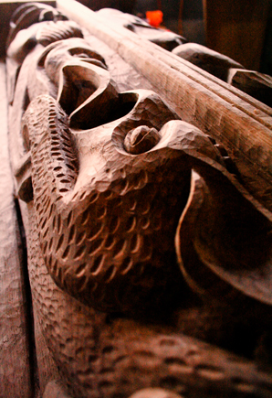 " La sculpture de charpente raconte une histoire, souvent composée de scènes de vie d'une époque, de bestiaires fantastiques et d'ornements.